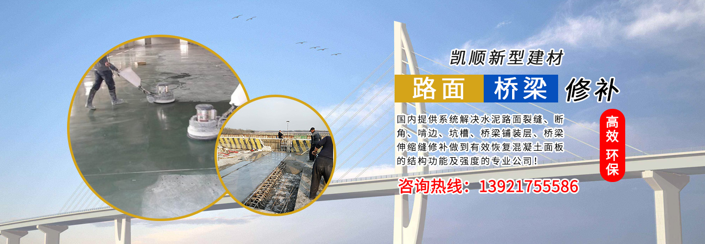 江蘇凱順新型建材有限公司是國內(nèi)提供系統(tǒng)解決水泥路面裂縫、斷角、啃邊、坑槽、橋梁鋪裝層、橋梁伸縮縫修補(bǔ)做到有效恢復(fù)混凝土面板的結(jié)構(gòu)功能及強(qiáng)度的專業(yè)公司!為市政工程、高速、國道、省道、縣鄉(xiāng)道路的改造及大修、中修等大型工程提供了快速、高效、環(huán)保、經(jīng)濟(jì)系統(tǒng)方案和技術(shù)支持!